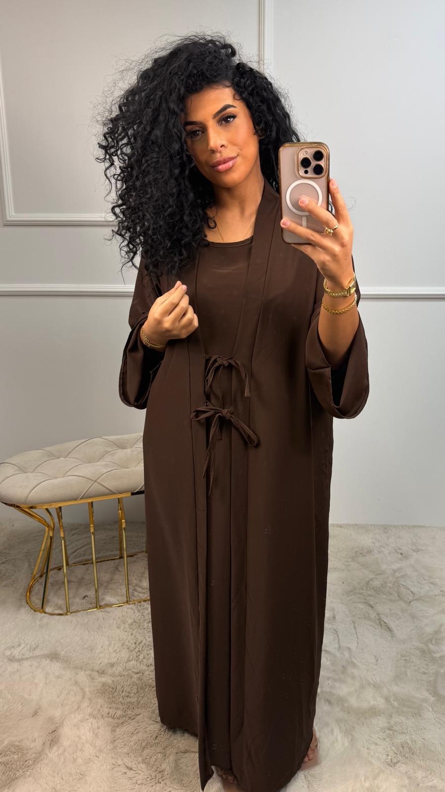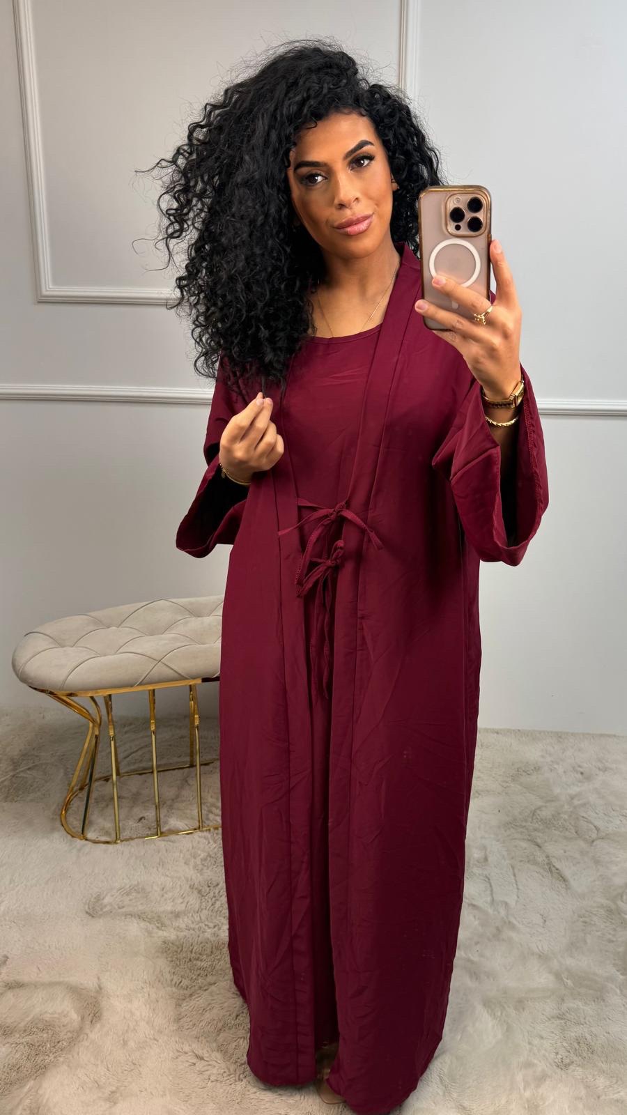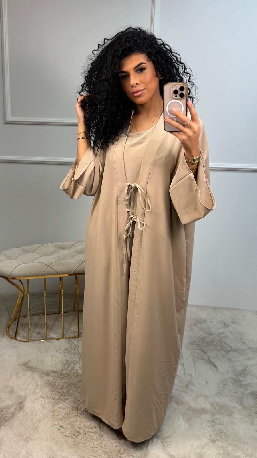 Deze set bestaat uit een abaya met subtiele glansstof én een bijpassende binnenjurk, waardoor je meteen een complete outfit hebt.