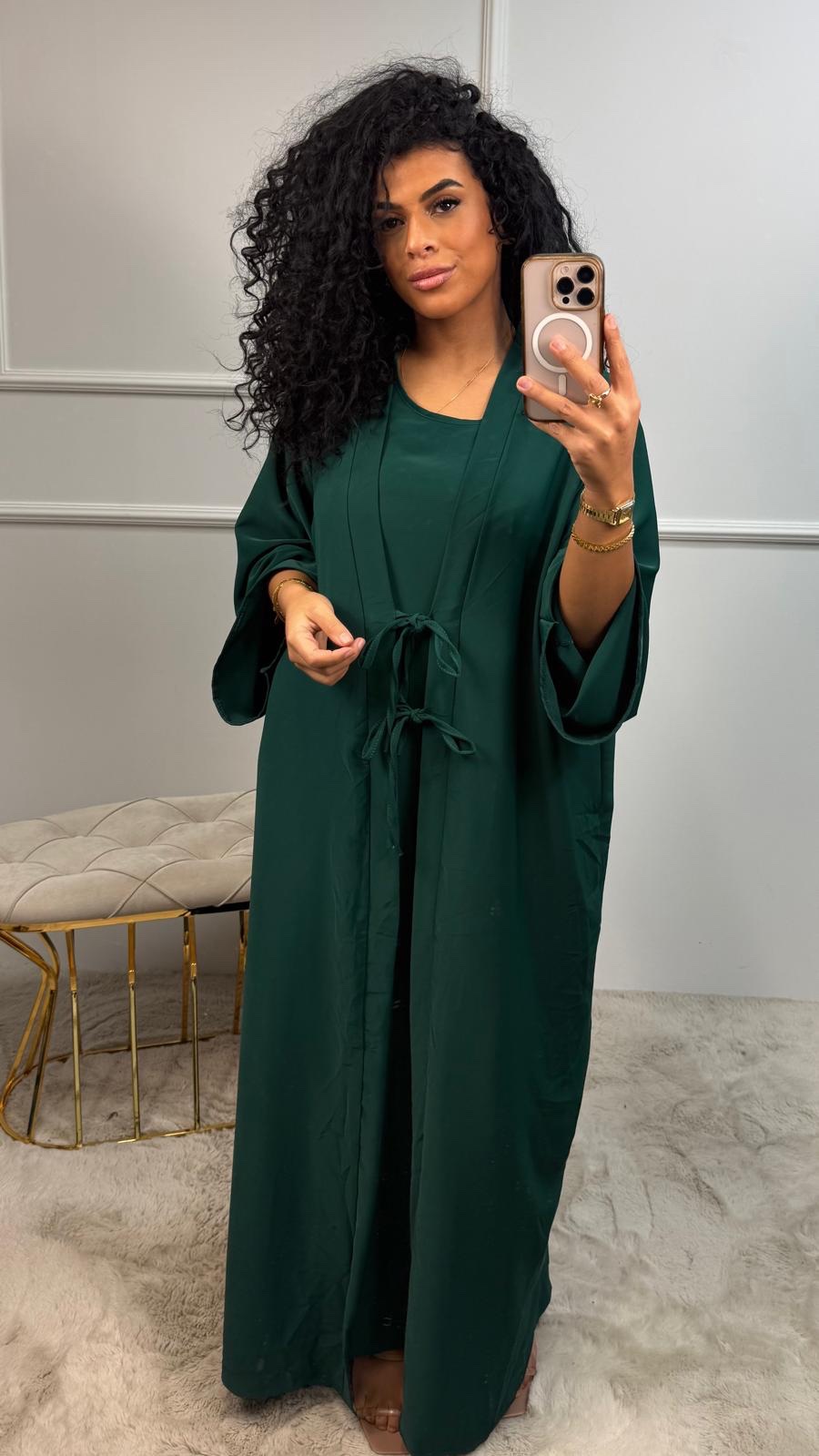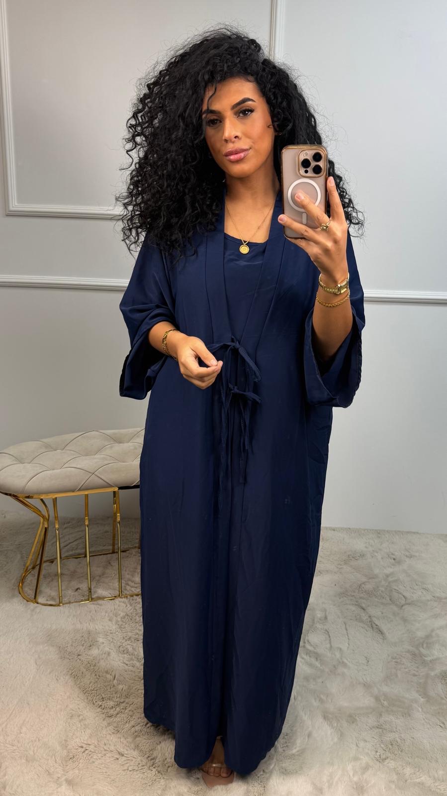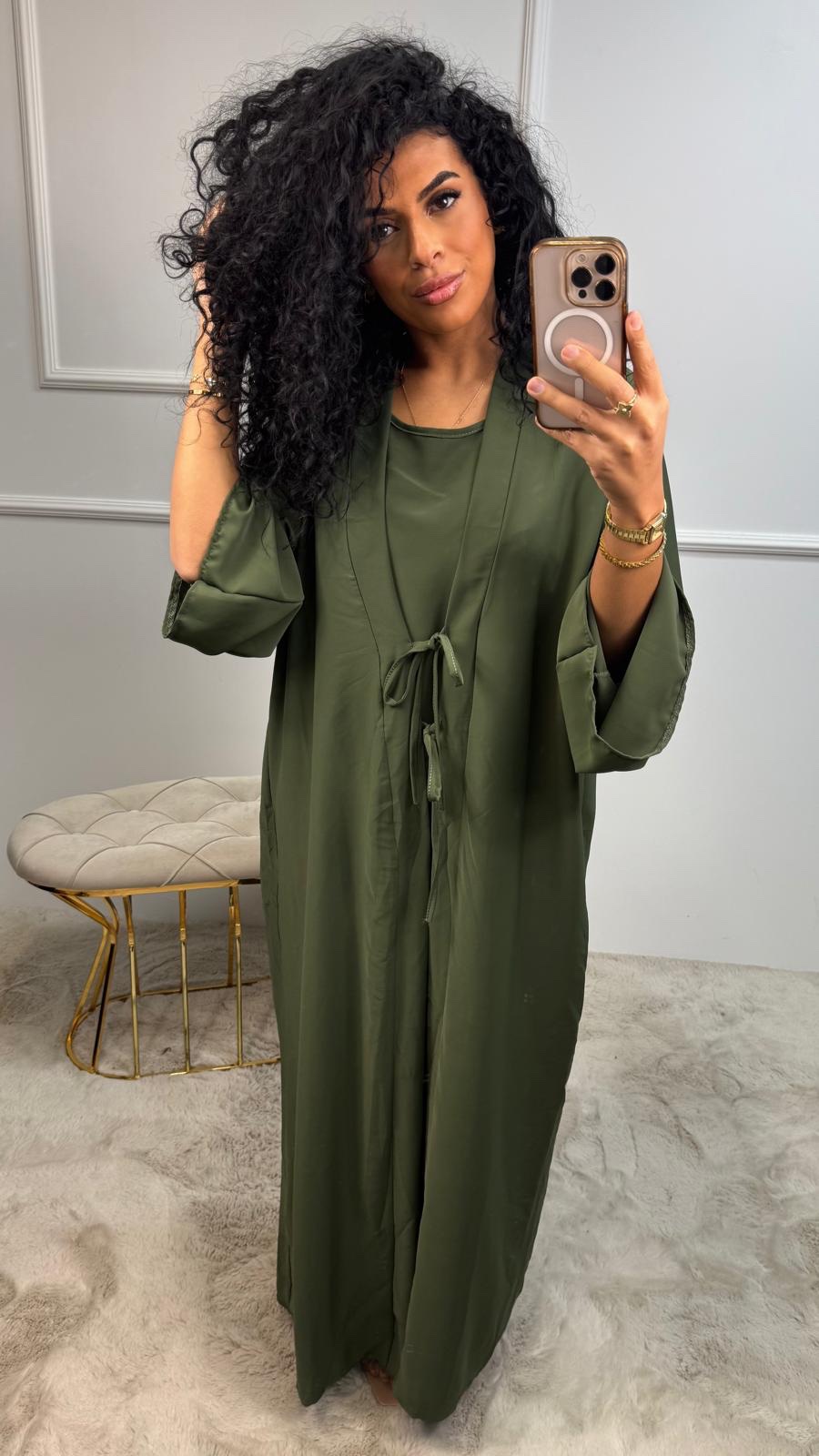 Deze set bestaat uit een abaya met subtiele glansstof én een bijpassende binnenjurk, waardoor je meteen een complete outfit hebt.