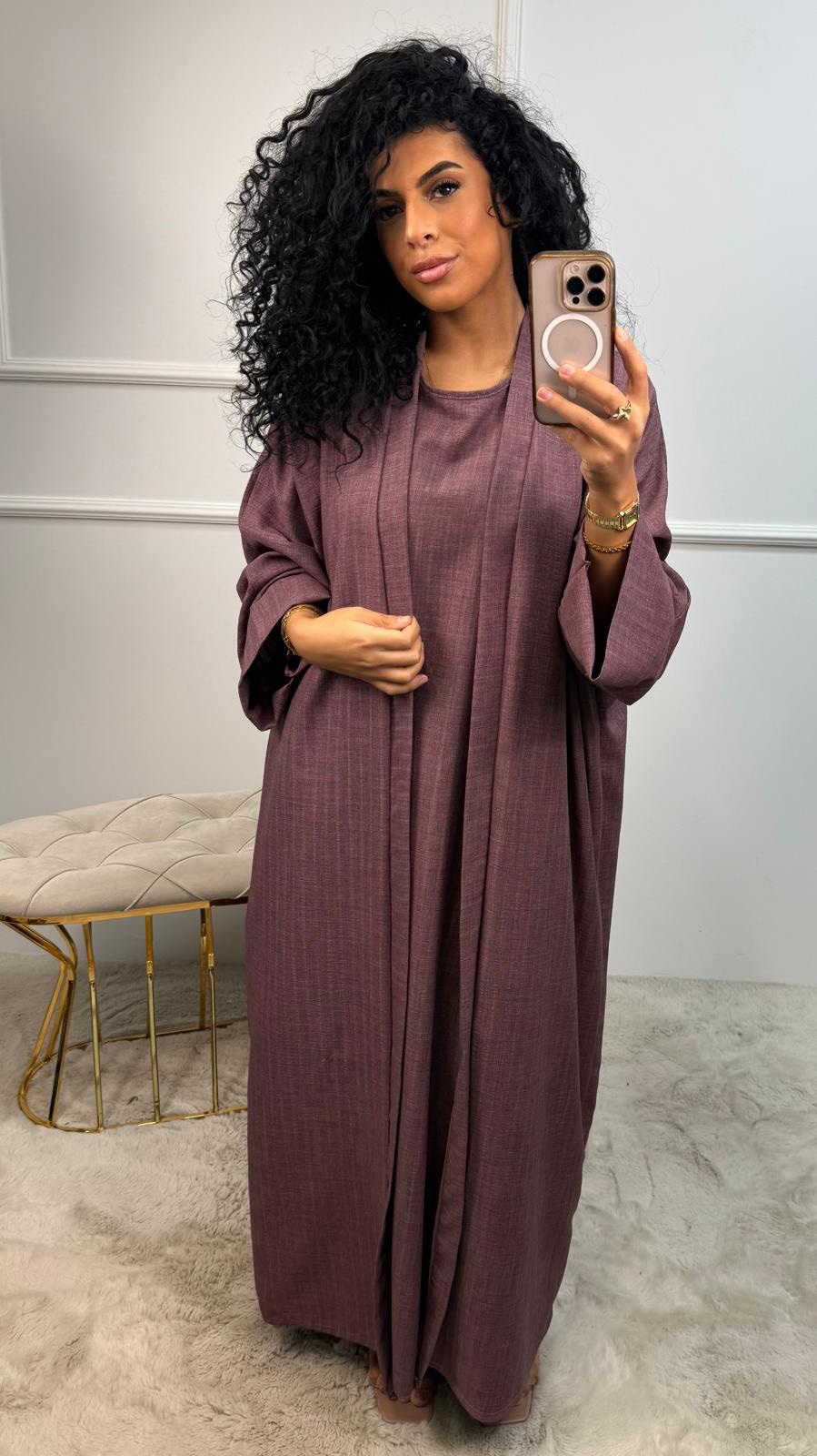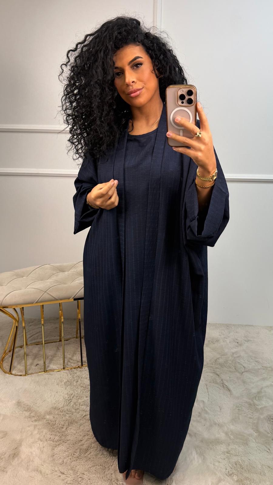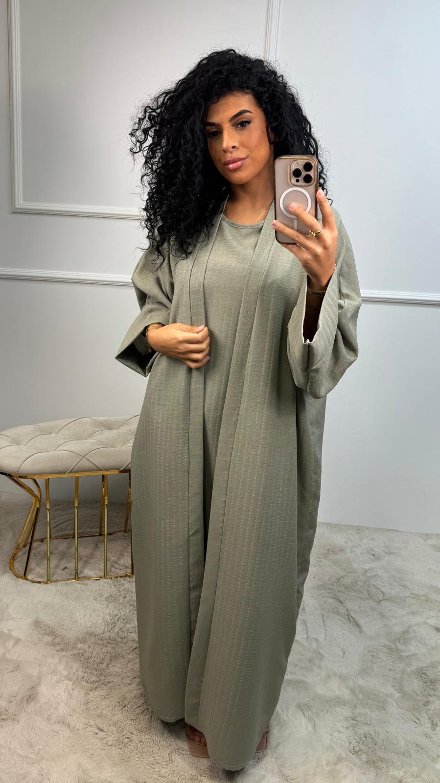 Deze set bestaat uit een prachtig vallende abaya met subtiele lijn-accents én een bijpassende binnenjurk — zodat je direct een complete, verzorgde outfit hebt zonder gedoe.