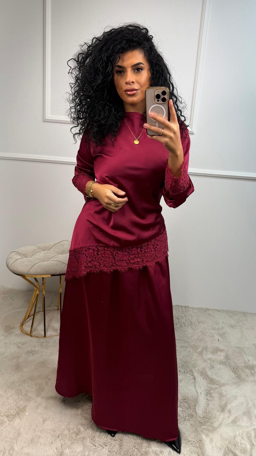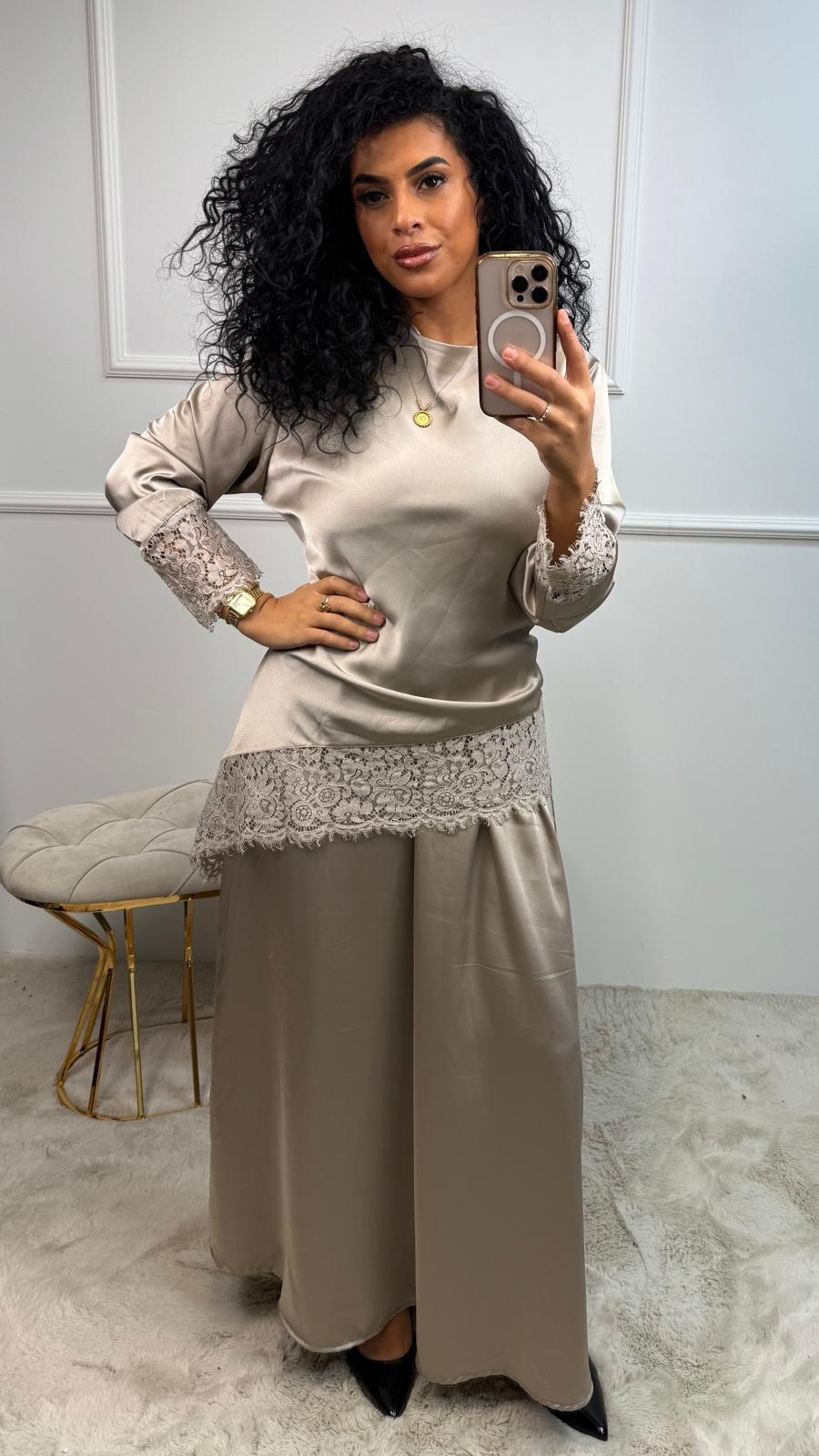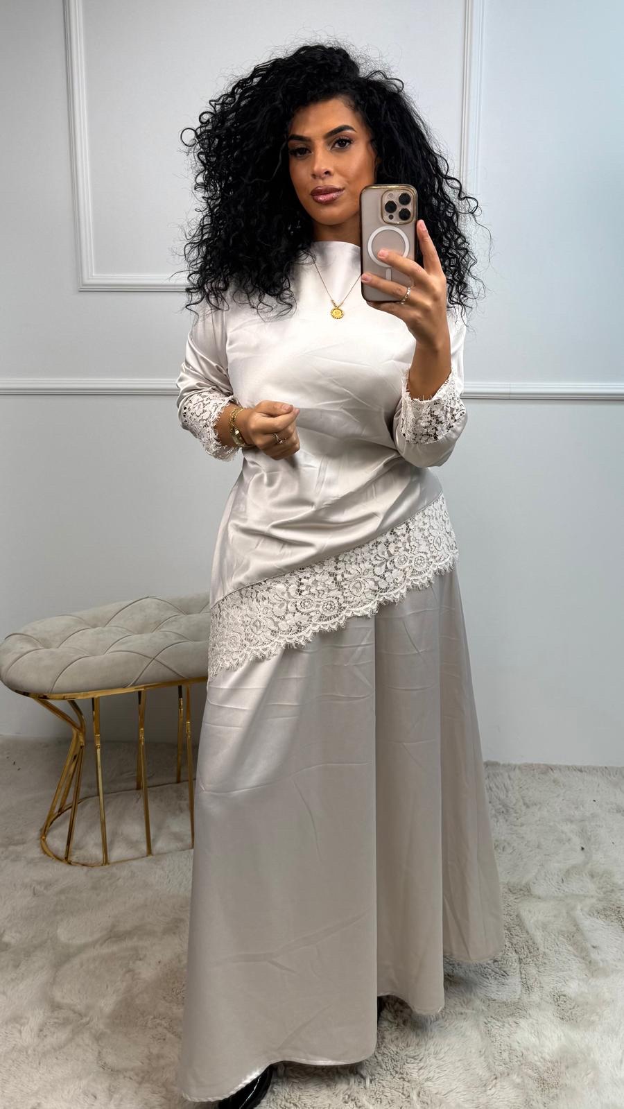 Deze elegante tweedelige set combineert een soepelvallende satijnen rok met subtiele kantdetails die zorgen voor een luxe, romantische uitstraling.